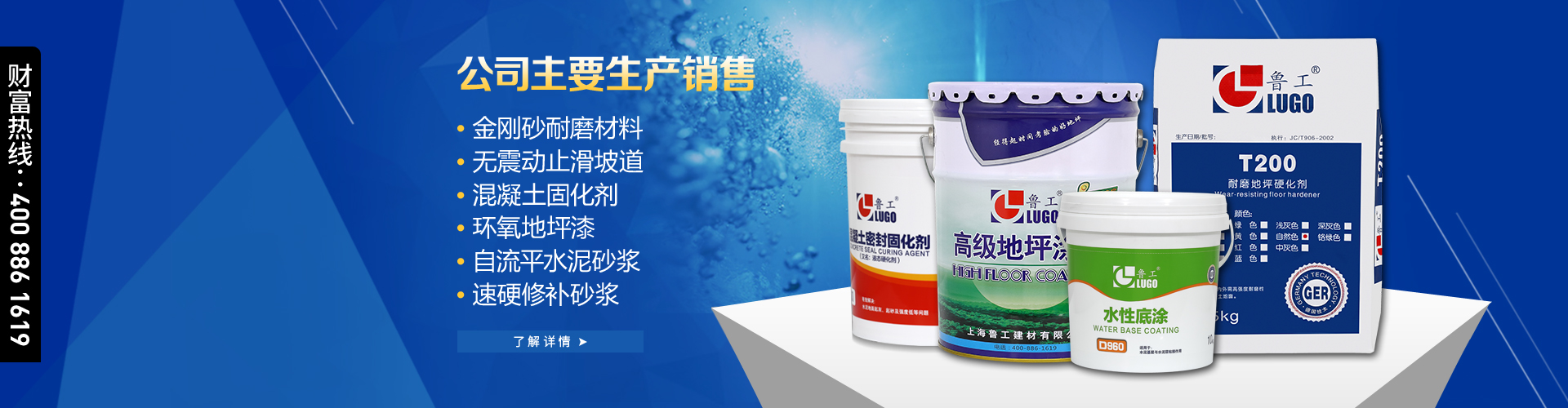 上海魯工建材有限公司——是一家集研發,生產,施工于一體的化學建材專業公司。產品主要包括環氧地坪,耐磨硬化地坪,運動場地,建筑干粉,以及建筑防腐,防水材料。 公司依靠科技人才優勢,采用進口原料,不斷開發新產品,并根據不同的客戶需要,從實際考慮設計恰當的方案,得到客戶一致認可,享有良好聲譽。 公司按照國家標準和行業標準,制定嚴格的生產流程和施工工藝,嚴格按照ISO9001國際質量體系生產施工,目前公司已全面實施一套現代化的科學管理模式,以確保企業健康,快速發展。 我們以“質量為先,誠信為本,服務為重”的 經營理念,以“精益求精,永無止境”的企業精神,為您提供優質產品和滿意服務。